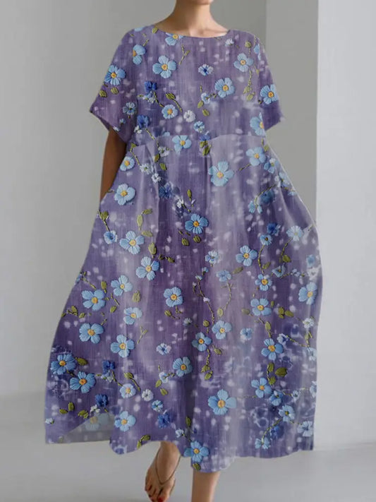 Women's Watercolor Floral Art Print Cotton Linen Short Sleeve Pocket Dress