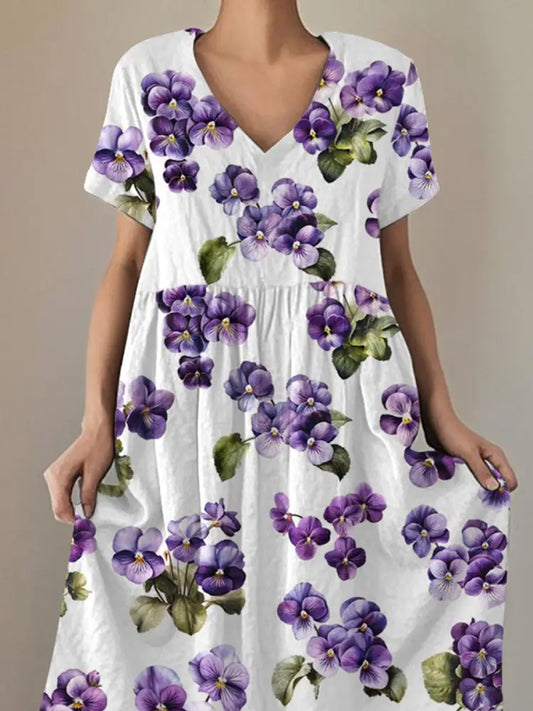 • Women’s Purple Pansy Print Alzheimer’s Awareness Support Short-Sleeve Dress White / S Women’s Clothing