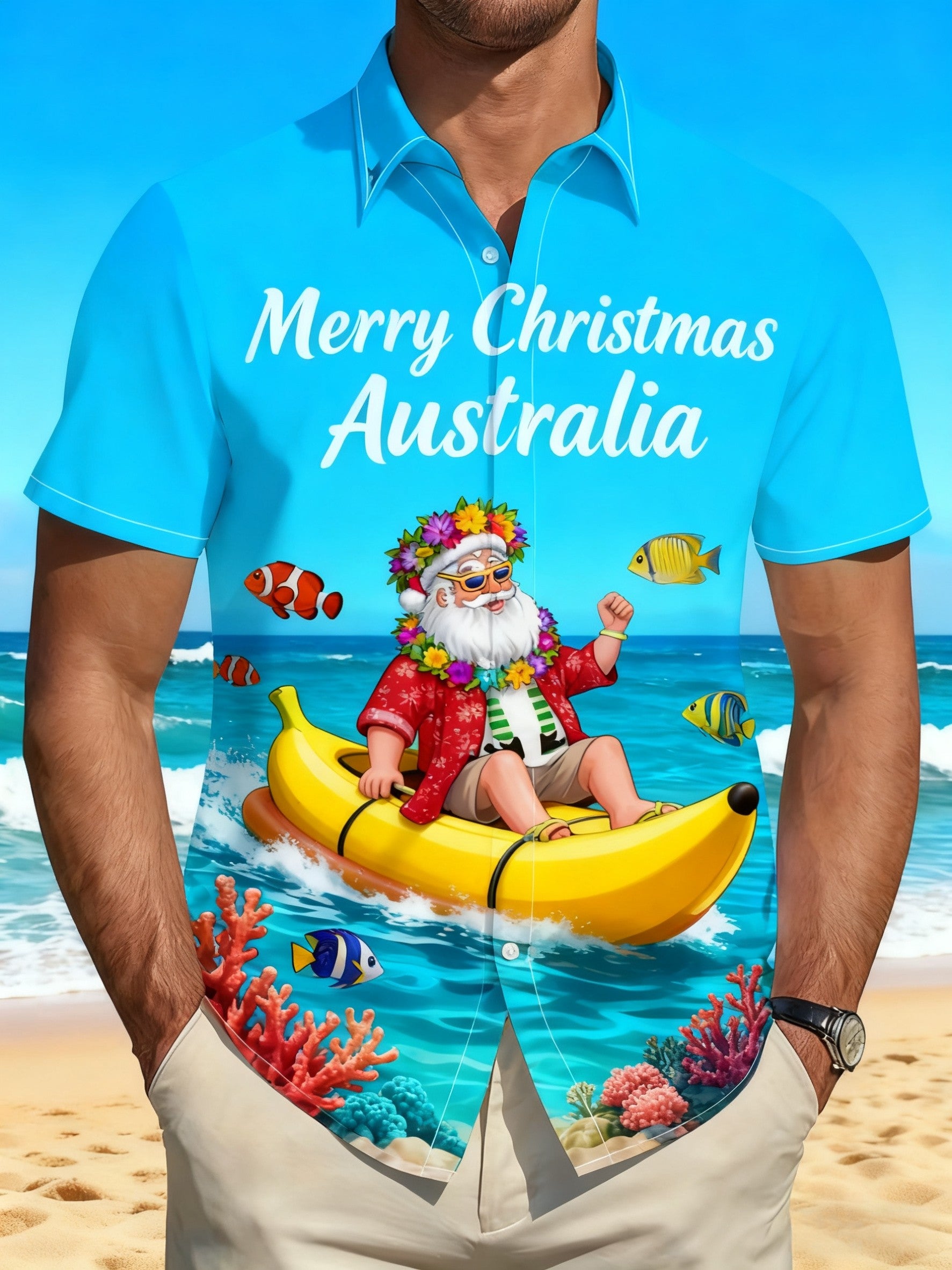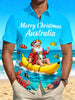 Men's Retro Australian Christmas Santa Claus Beach Abstract Print Casual Cotton Short Sleeve Shirt