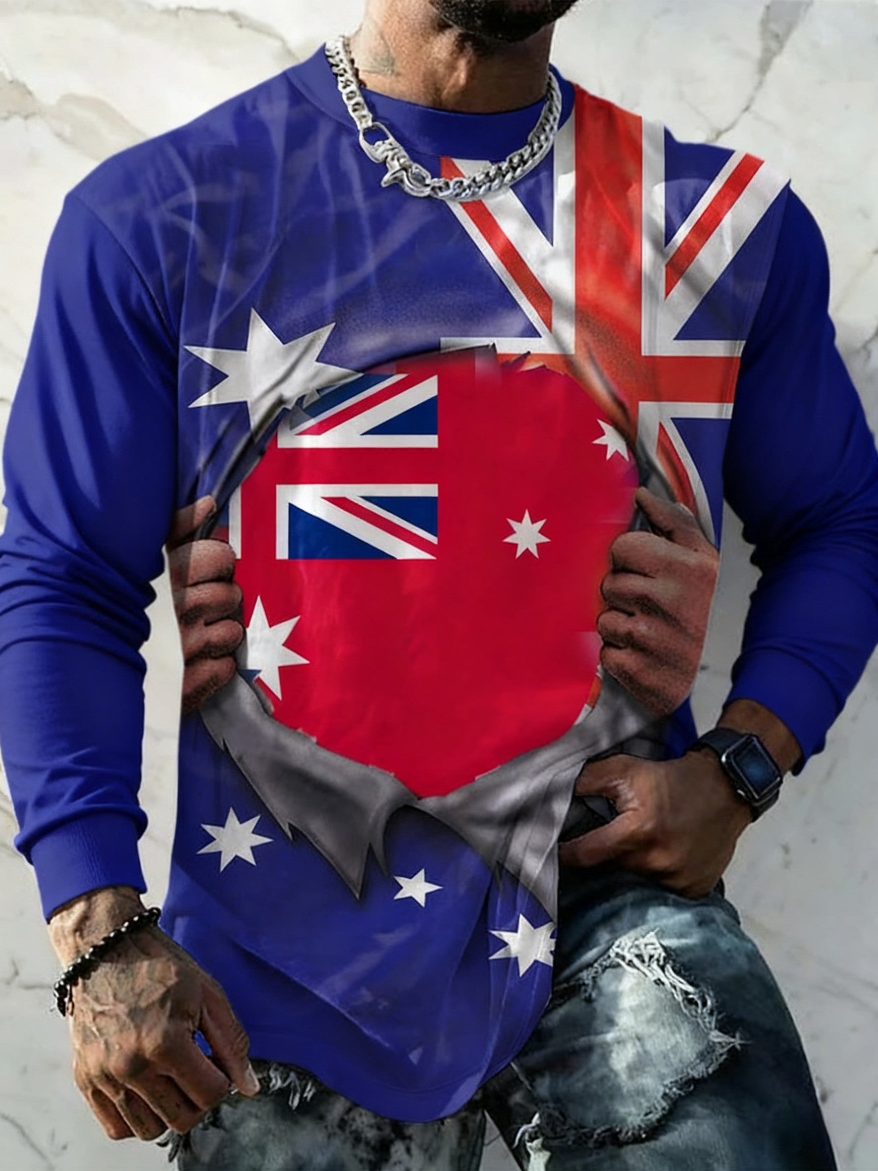 Vintage Australian Flag Badge Print Casual Long Sleeve Round Neck T-Shirt